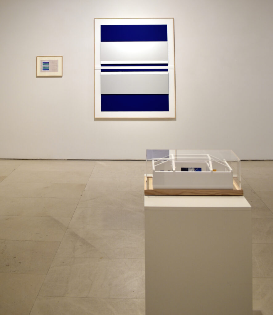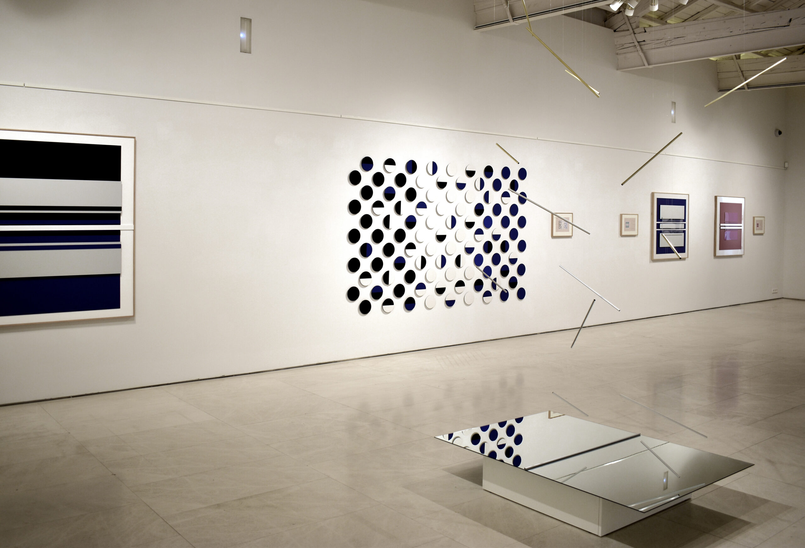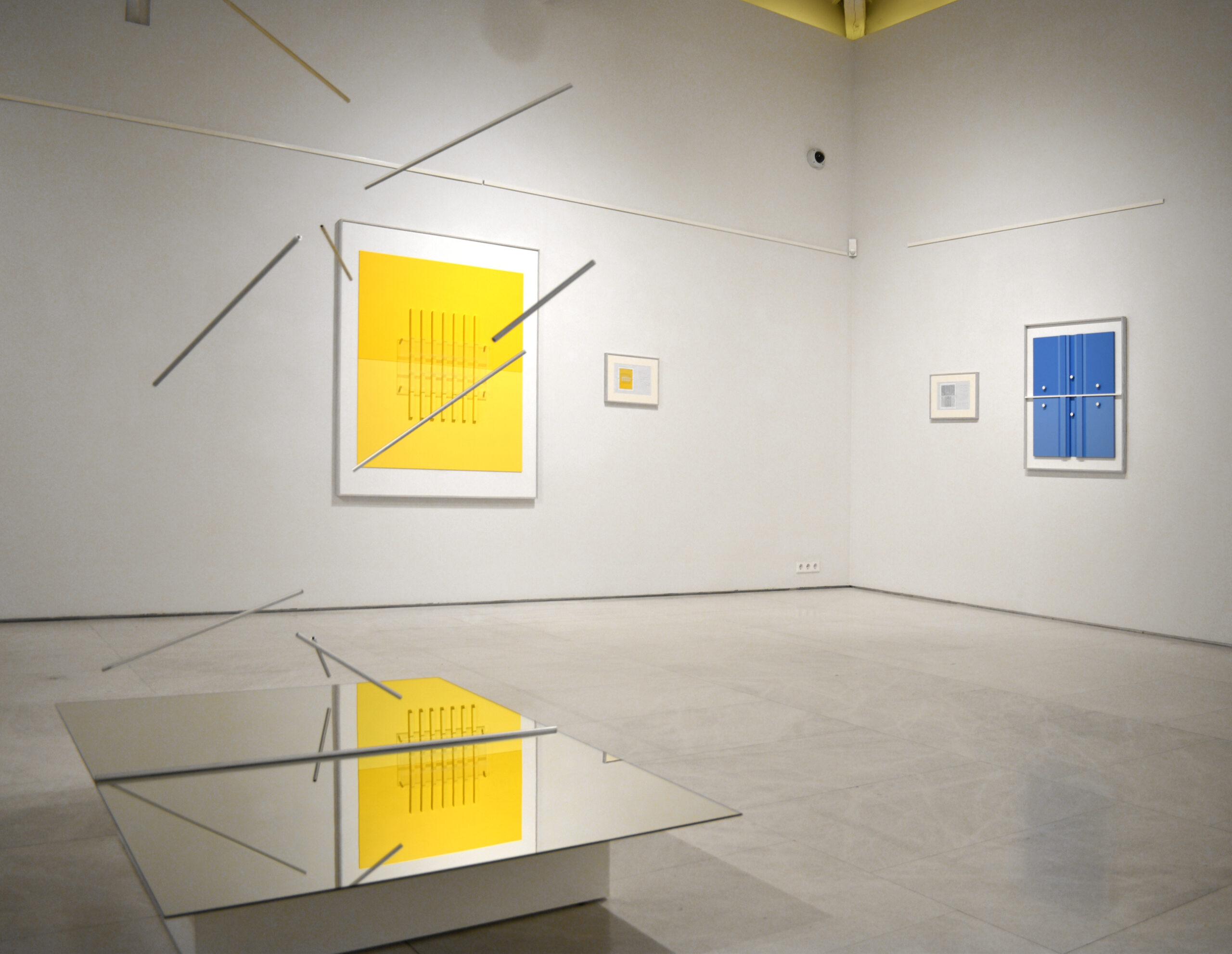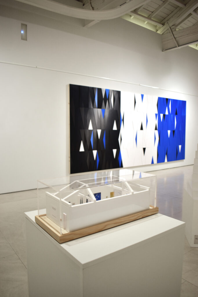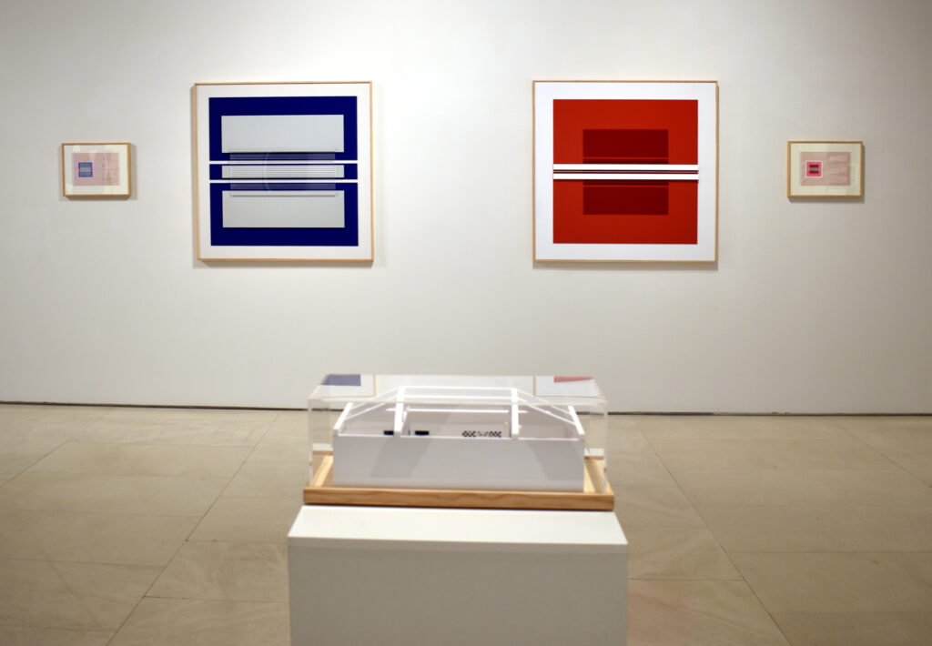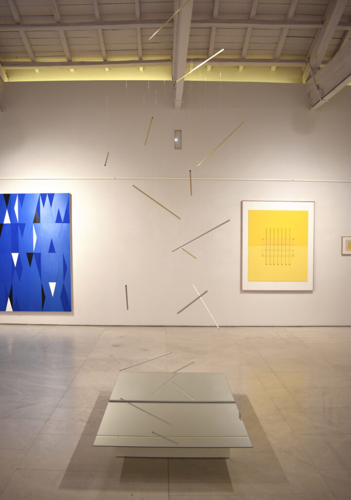 Por ello, en “El espacio entre líneas” se presentan esculturas terminadas de Robert Ferrer i Martorell, acompañadas de dibujos previos y la maqueta del proyecto expositivo, que permiten acceder al andamiaje conceptual de su trabajo sin desvelar el misterio que contiene. En esta muestra el foco de atención se centra en tres temas principales: gravidez, proporción y movimiento. En la obra expuesta se trasluce el dominio del material de Ferrer, una técnica que busca el equilibrio entre los procedimientos industriales y artesanales mediante una producción poética. Construye la realidad desde módulos y estructuras abstractas extraídas de la materia, cuyo orden regulador ofrece precisión, claridad, exactitud y luz. La evolución de su obra evidencia una progresiva depuración formal, en la que la reducción de componentes y el empleo de relaciones modulares genera un sistema austero pero fértil, que confluye con las teorías defendidas por Klee. Su escultura articula el espacio mediante ritmos visuales análogos a la música, donde los valores de armonía, intensidad y movimiento se traducen en variaciones cromáticas. Ferrer emplea módulos como unidad constructiva repetida, donde resuenan los ecos del neoplasticismo y las enseñanzas de la Bauhaus. Produce un esquema reiterado que remite a la arquitectura clásica, cuya ley es el ritmo; una rima geométrica que opera como pulsación ordenadora próxima al término “eurythmia”, que Vitruvio empleaba para designar el encadenamiento de las proporciones. Este patrón estructural también ayuda a diferenciar las diversas maneras de abordar los límites de las obras, desde las precisas fronteras triangulares de “Estructures en construcció”, hasta desvanecerse en las composiciones de “Proporcions”, o la instalación de varillas pendulares.