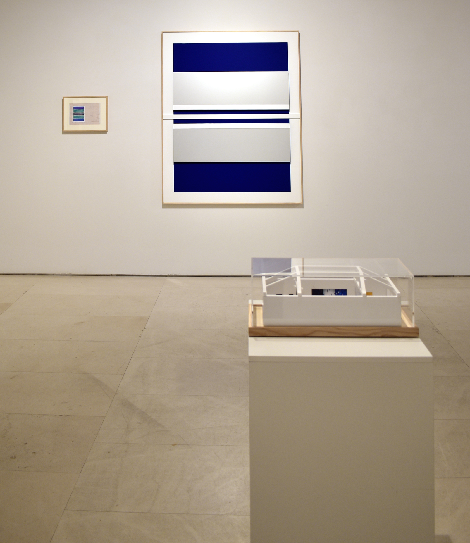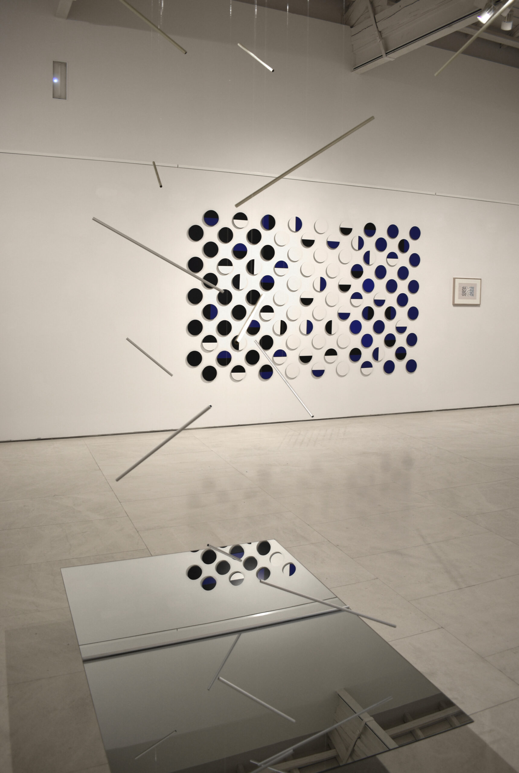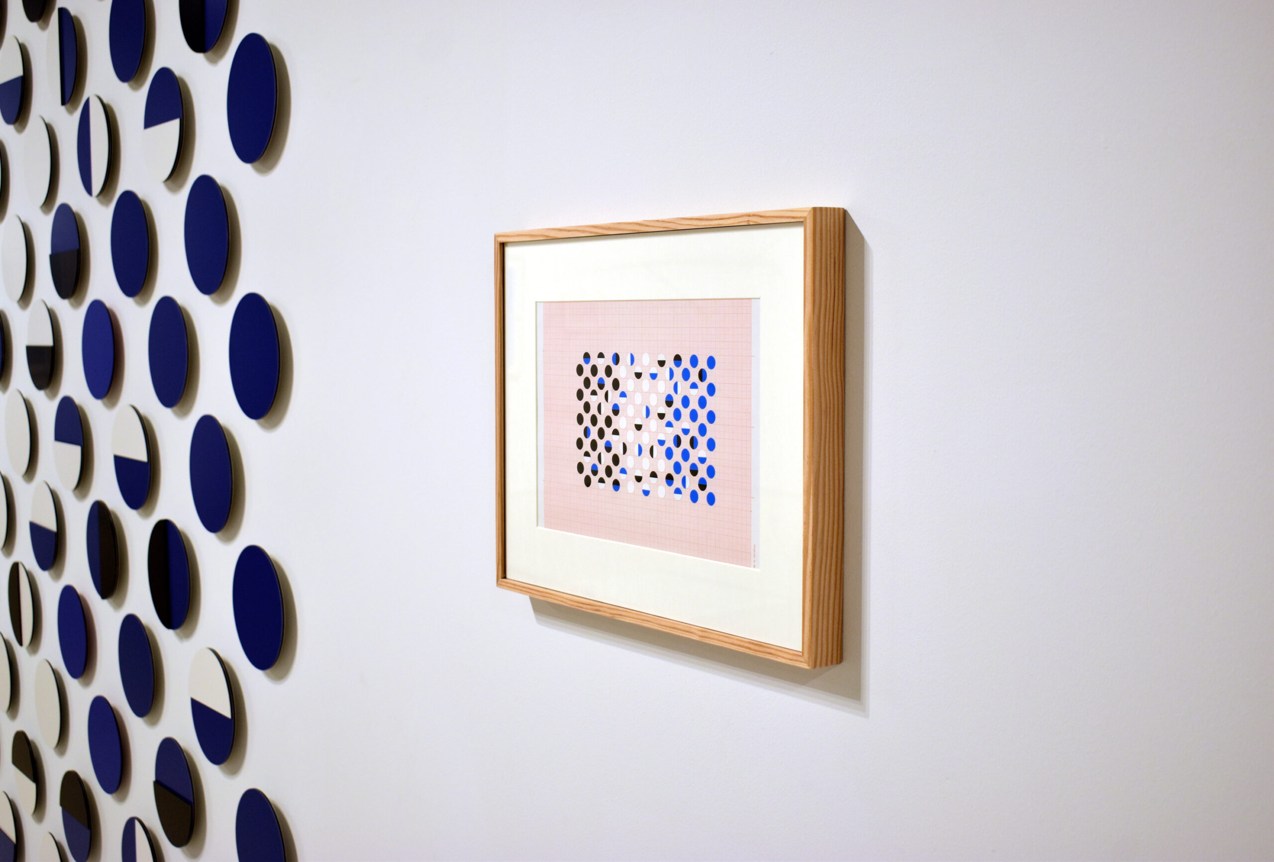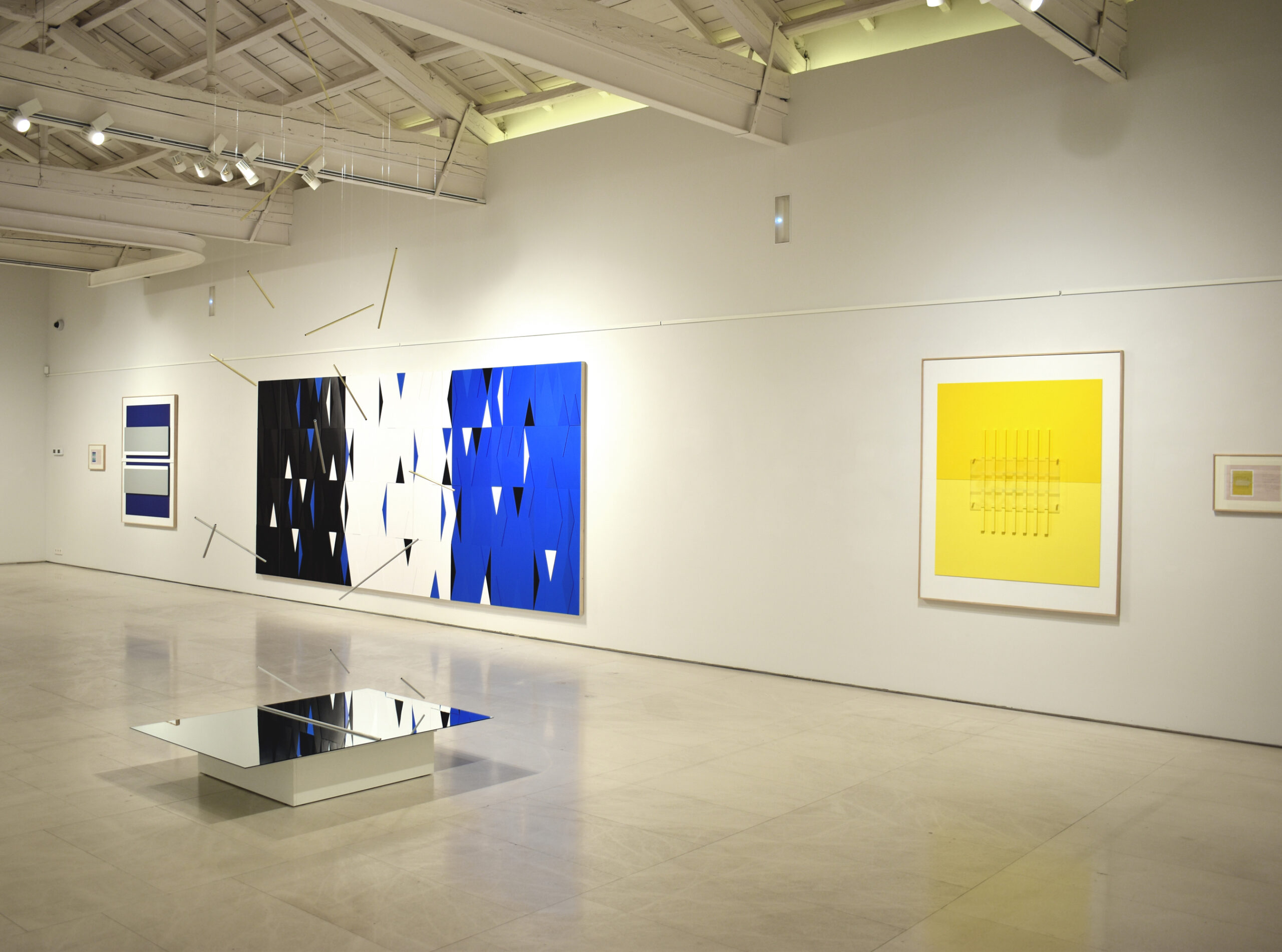 Por ello, en “El espacio entre líneas” se presentan esculturas terminadas de Robert Ferrer i Martorell, acompañadas de dibujos previos y la maqueta del proyecto expositivo, que permiten acceder al andamiaje conceptual de su trabajo sin desvelar el misterio que contiene. En esta muestra el foco de atención se centra en tres temas principales: gravidez, proporción y movimiento. En la obra expuesta se trasluce el dominio del material de Ferrer, una técnica que busca el equilibrio entre los procedimientos industriales y artesanales mediante una producción poética. Construye la realidad desde módulos y estructuras abstractas extraídas de la materia, cuyo orden regulador ofrece precisión, claridad, exactitud y luz. La evolución de su obra evidencia una progresiva depuración formal, en la que la reducción de componentes y el empleo de relaciones modulares genera un sistema austero pero fértil, que confluye con las teorías defendidas por Klee. Su escultura articula el espacio mediante ritmos visuales análogos a la música, donde los valores de armonía, intensidad y movimiento se traducen en variaciones cromáticas. Ferrer emplea módulos como unidad constructiva repetida, donde resuenan los ecos del neoplasticismo y las enseñanzas de la Bauhaus. Produce un esquema reiterado que remite a la arquitectura clásica, cuya ley es el ritmo; una rima geométrica que opera como pulsación ordenadora próxima al término “eurythmia”, que Vitruvio empleaba para designar el encadenamiento de las proporciones. Este patrón estructural también ayuda a diferenciar las diversas maneras de abordar los límites de las obras, desde las precisas fronteras triangulares de “Estructures en construcció”, hasta desvanecerse en las composiciones de “Proporcions”, o la instalación de varillas pendulares.